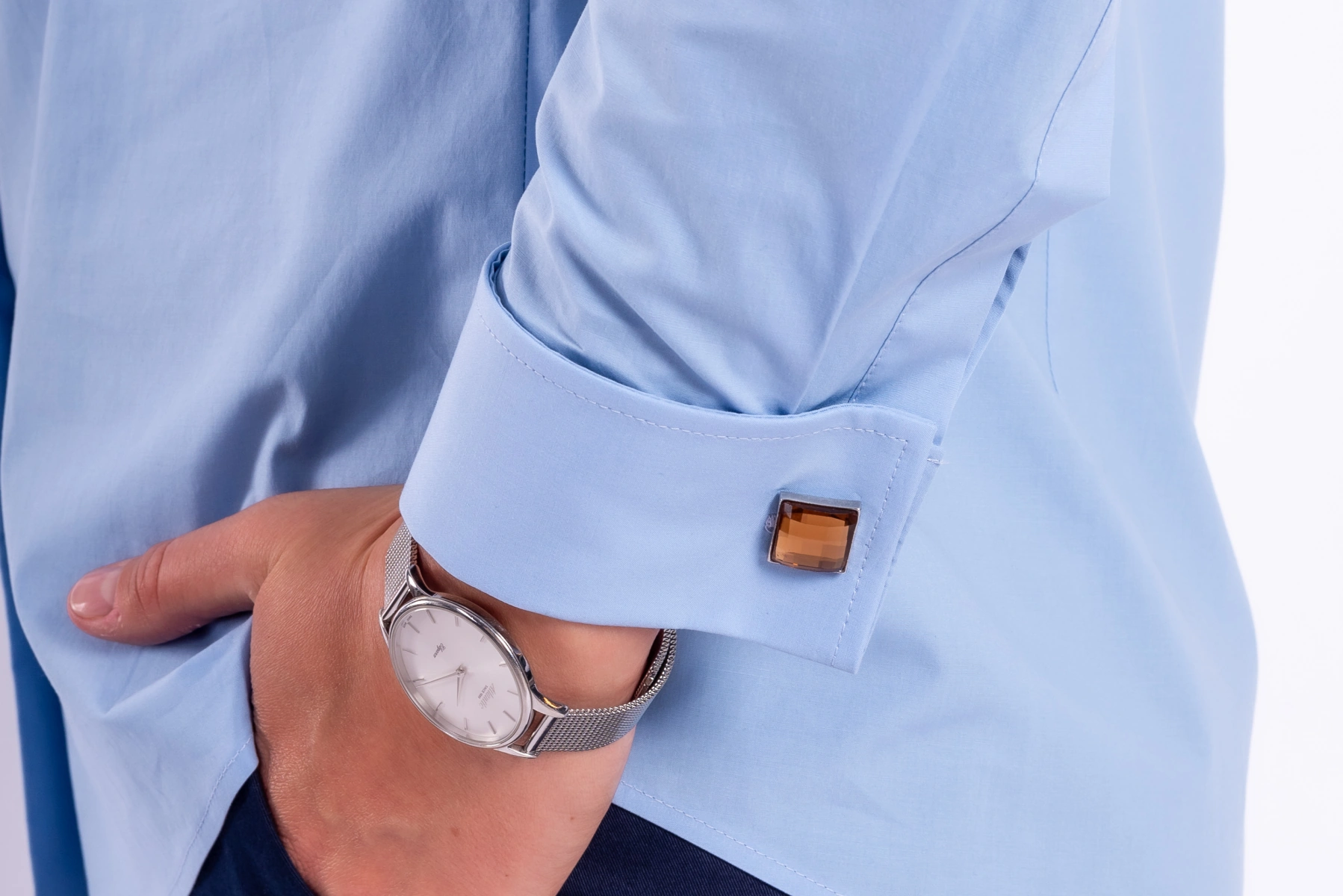 - Szerokie mankiety zapinane na eleganckie spinki
