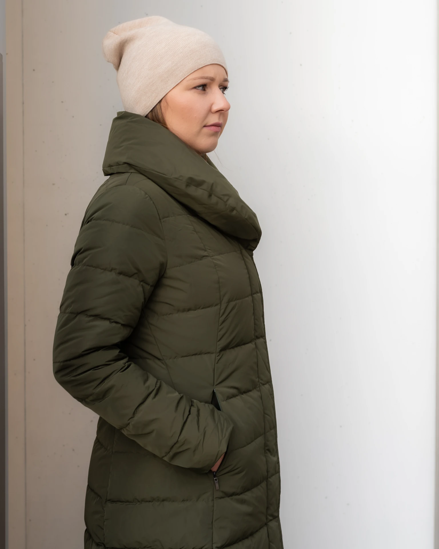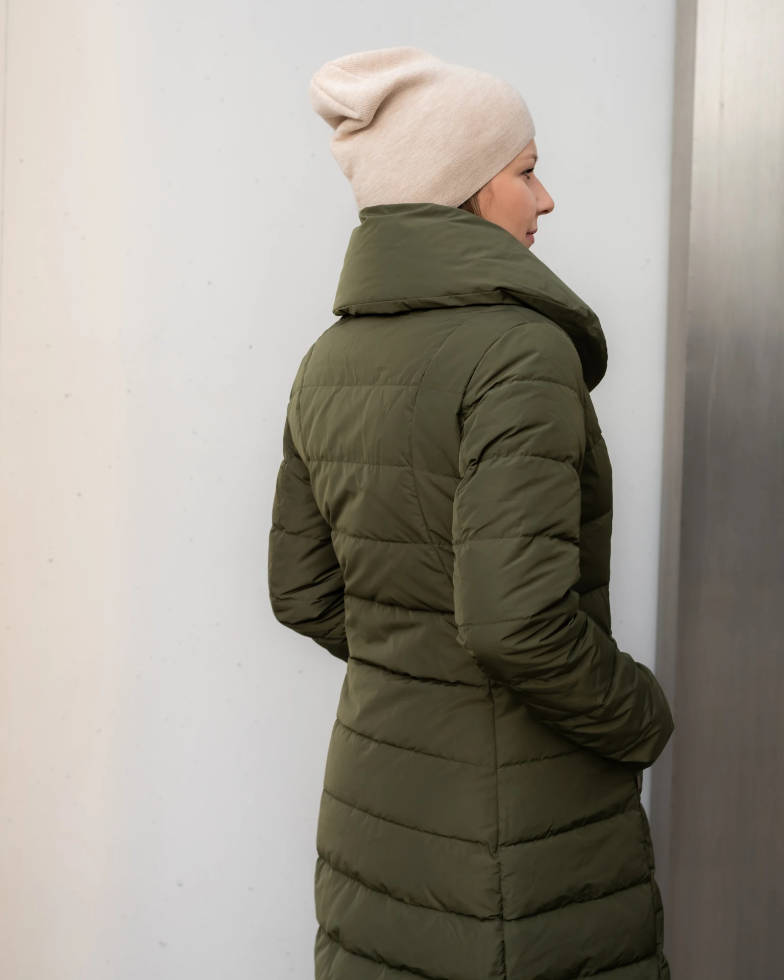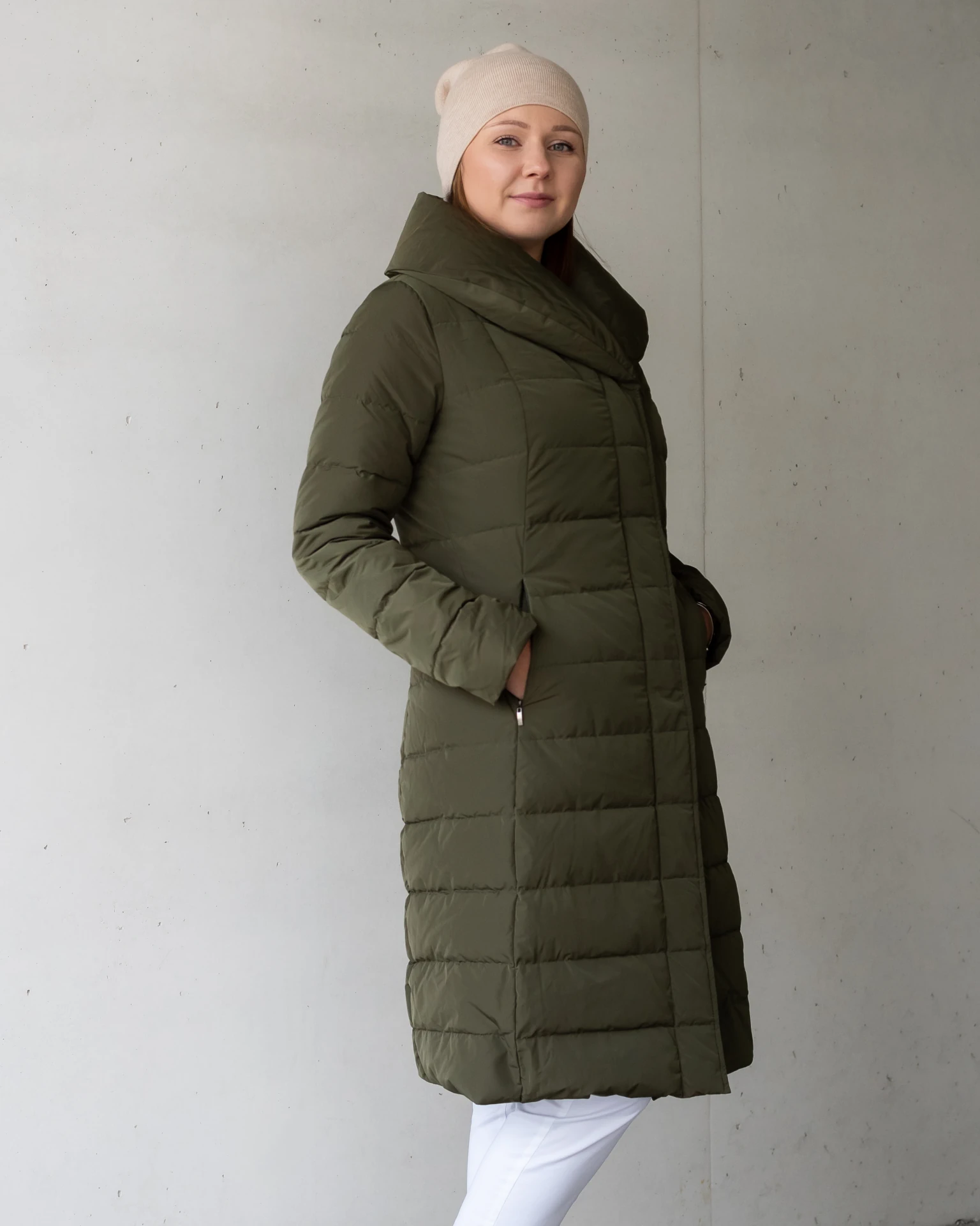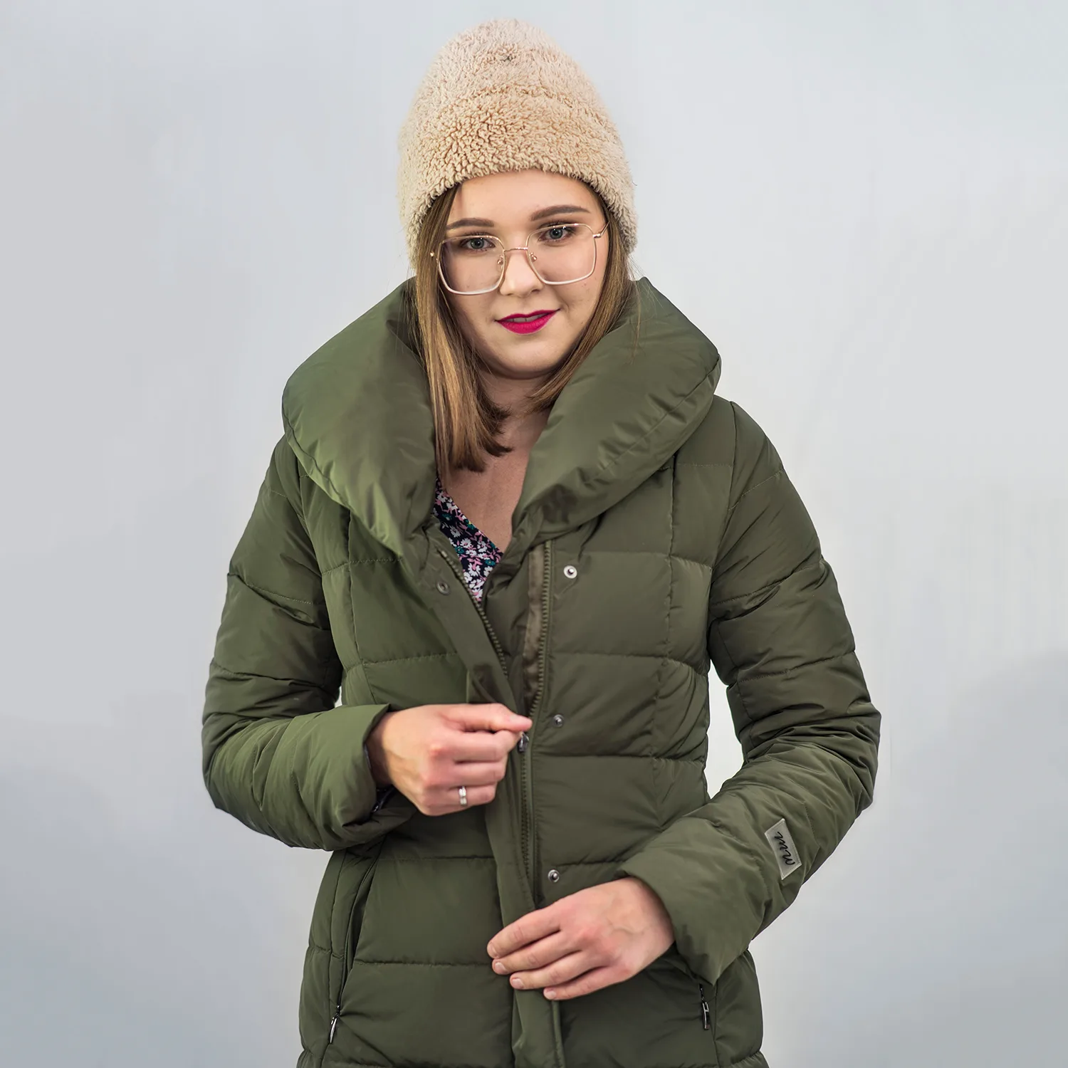 Ciepły płaszcz puchowy z kołnierzem szalowym – khaki