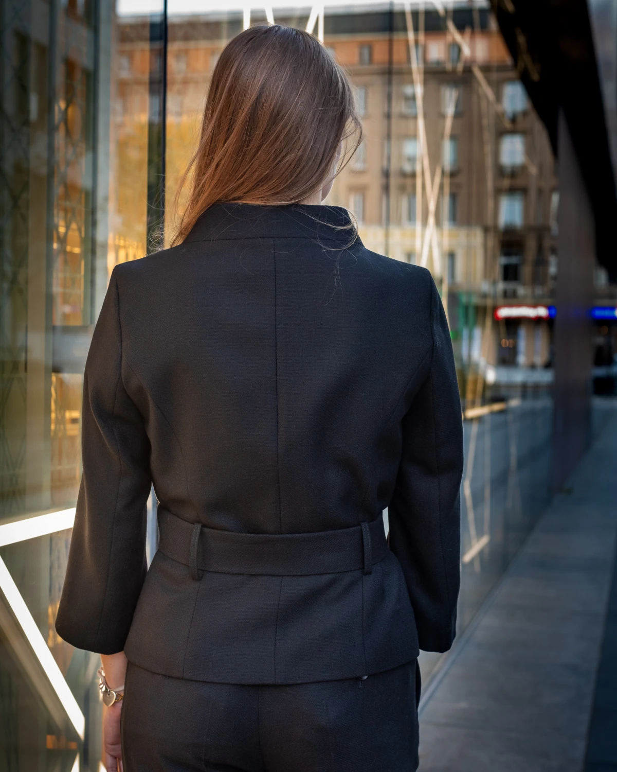 - Krótki żakiet o dopasowanym kroju z paskiem w talii