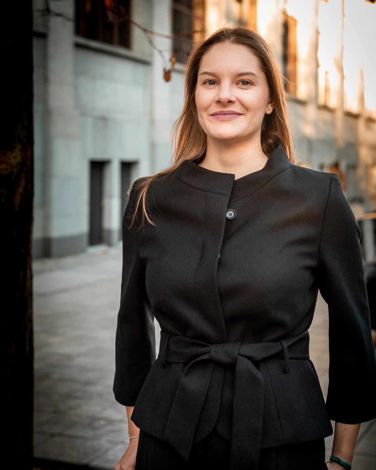 Ten krótki, wełniany żakiet w eleganckim, klasycznym czarnym kolorze uszyliśmy z miękkiej, a jednocześnie nieco grubszej wełny, a środek wykończyliśmy starannie podszewką. Takie rozwiązanie zapewnia komfort noszenia i stanowi świetną propozycję również na chłodniejsze chłodniejsze dni. Ponadto jego dopasowany krój z paskiem w talii pięknie podkreśla sylwetkę, natomiast stójka i rękaw 3/4 z subtelnym pęknięciem nadają mu szykownego, niebanalnego charakteru. Co więcej, kryte zapięcie nadaje dodatkowej, dyskretnej elegancji.