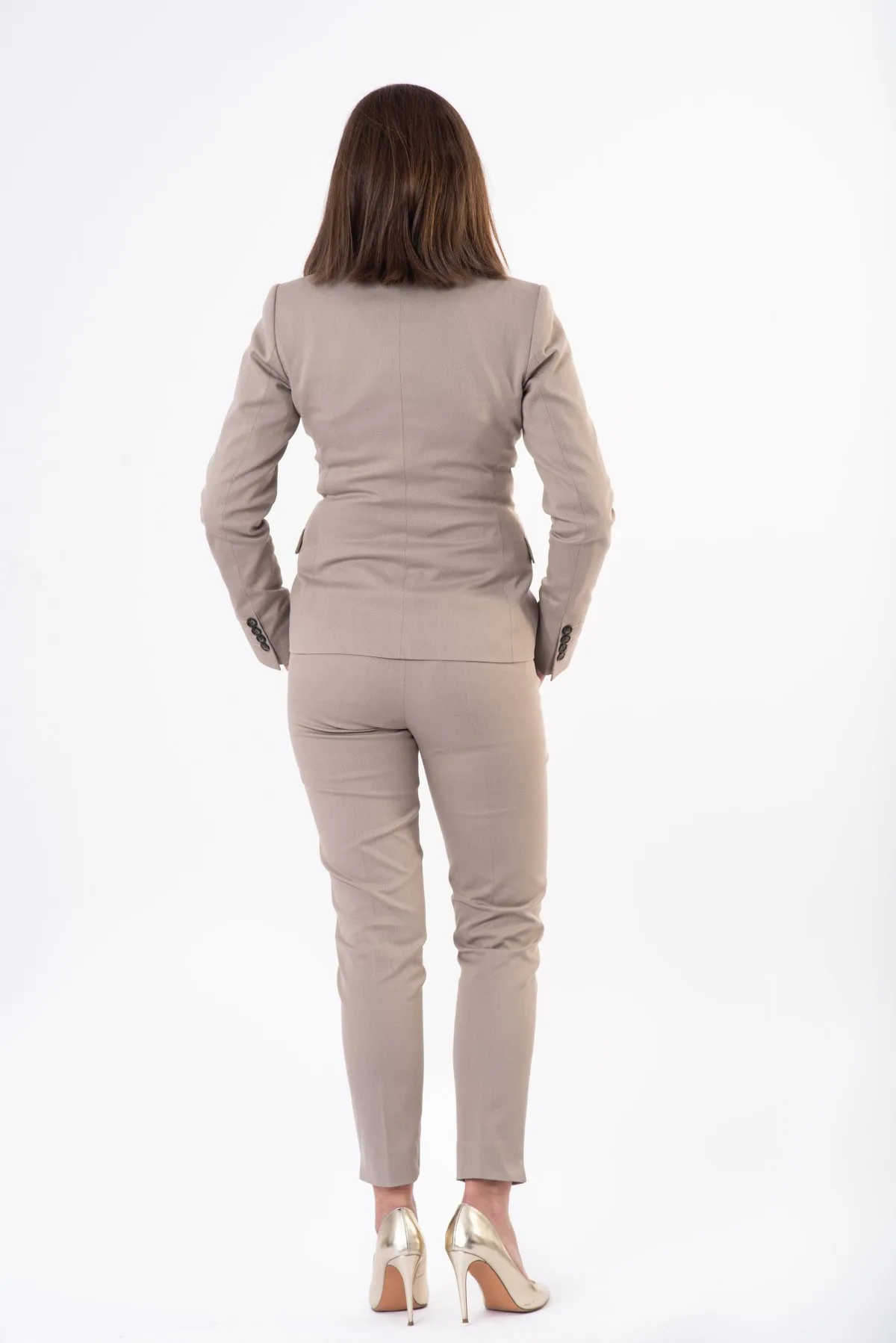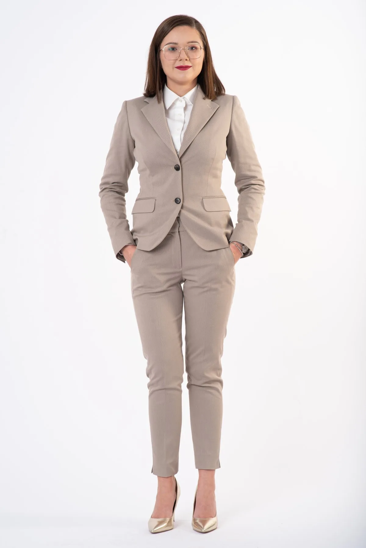 Do prezentowanego żakietu szczególnie polecamy nasze beżowe spodnie slim oraz białą i morską koszulę. Połączenie takie stanowi wyjątkowy damski garnitur!
