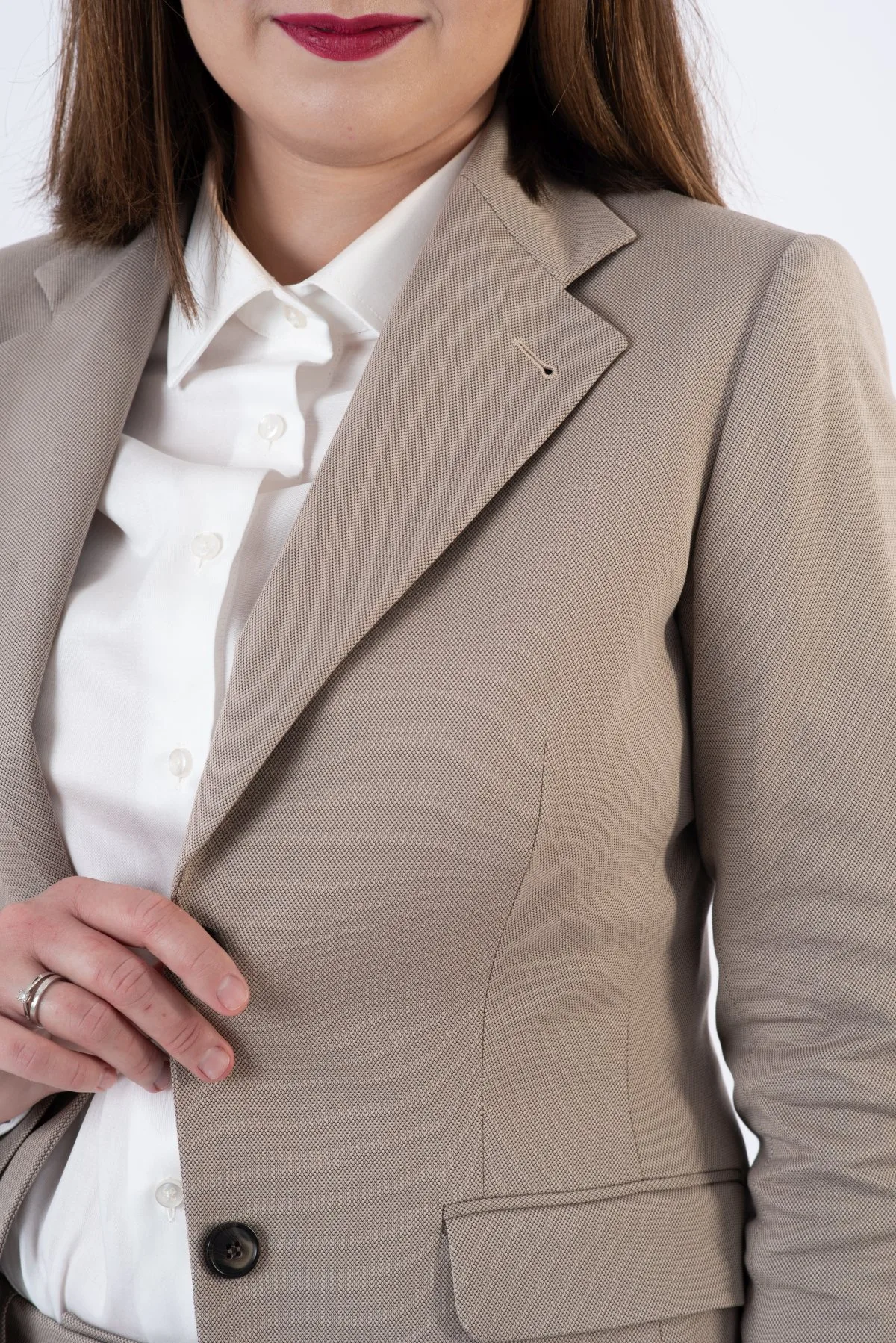 Żakiet o klasycznym kroju, ale krótszy i zdecydowanie bardziej dopasowany w talii niż dwa pozostałe, zaprojektowane przez nas modele (żakiet w kolorze białym i ciemnobeżowym oraz żakiet dwurzędowy). Posiada szerszą klapę wraz z butonierką, które nadają mu wyjątkowego i tradycyjnego charakteru. Rękawy w żakiecie są wąskie, co dodatkowo modeluje kobiecą sylwetkę. Wewnątrz znajduję się kieszonka zapinana na kryty guzik oraz biała koronka, która jest symbolem naszej marki. Nad lewą boczną kieszonką umieściłyśmy subtelne blaszki z naszym logo. Wszystko to sprawia, że żakiet jest bardzo elegancki i ponadczasowy. Idealnie pasuje do oficjalnych stylizacji, ale sprawdzi się również w przypadku mniej formalnych okazji, takich jak chociażby randka czy spotkanie rodzinne. Zaprojektowany został tak, aby wszystkie Kobiety, niezależnie od wieku i posiadanego rozmiaru, wyglądały w nim wyjątkowo.
